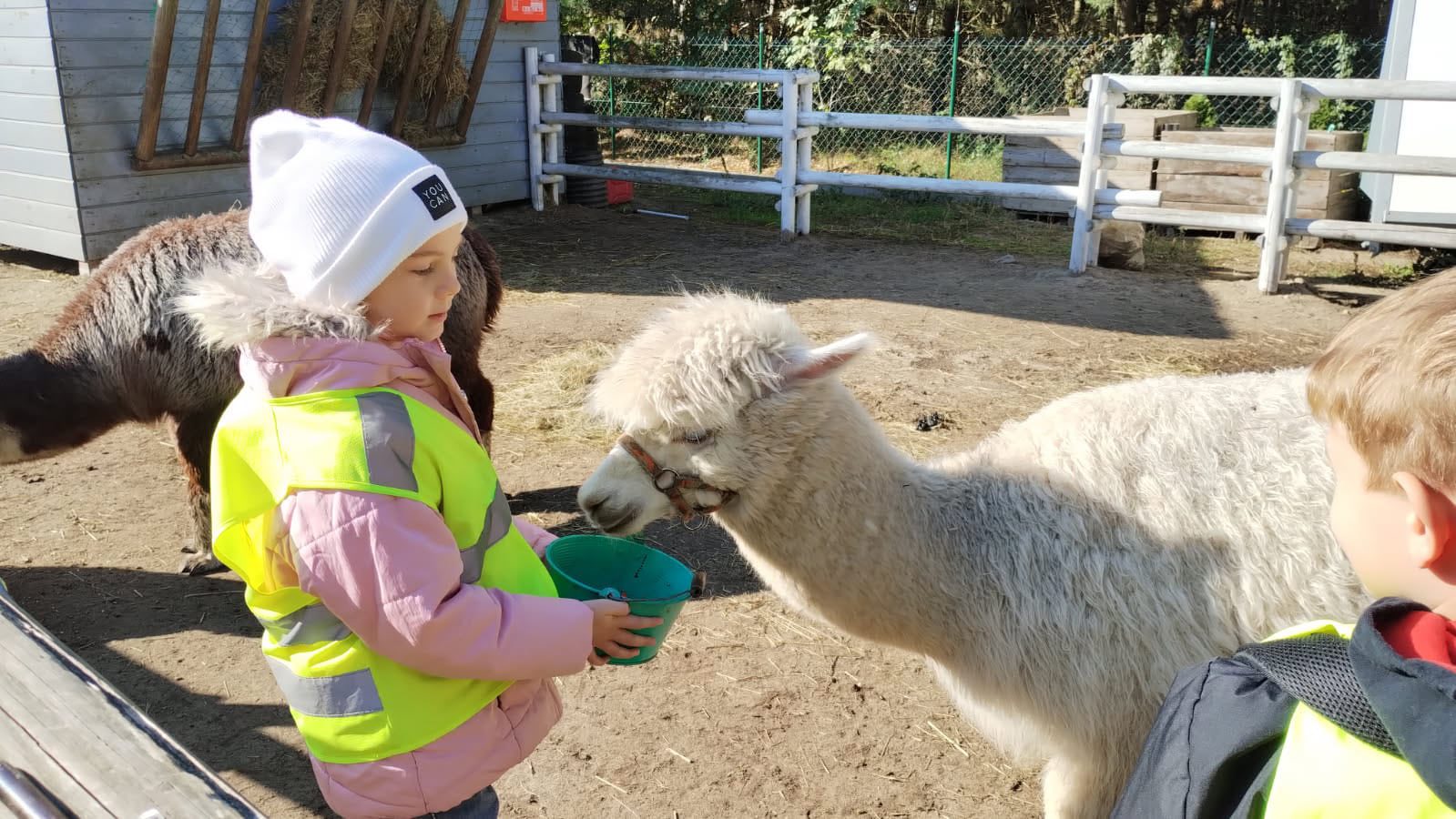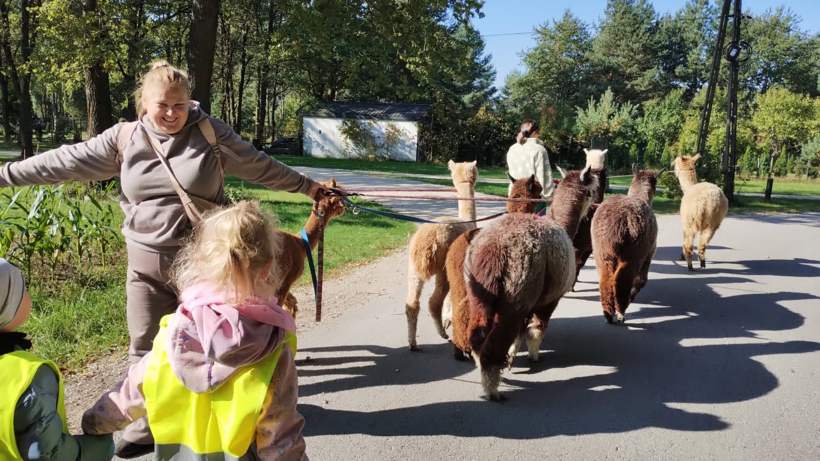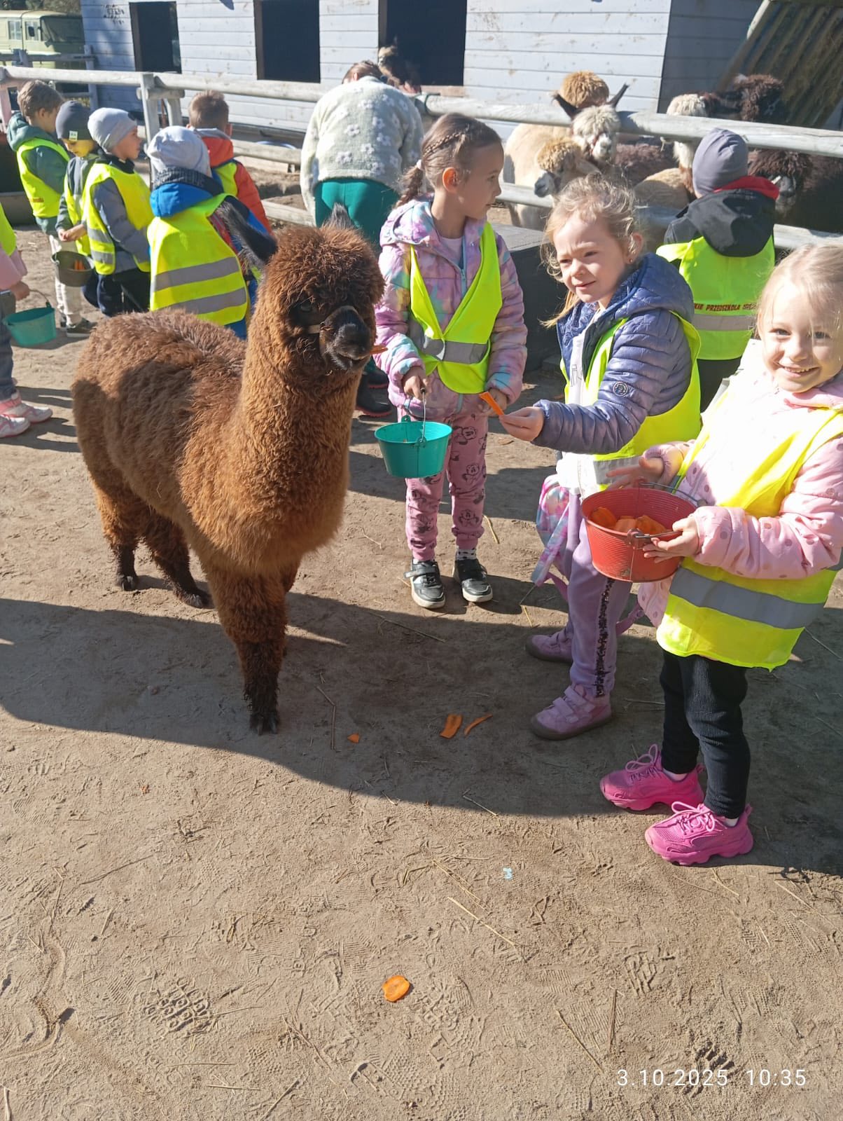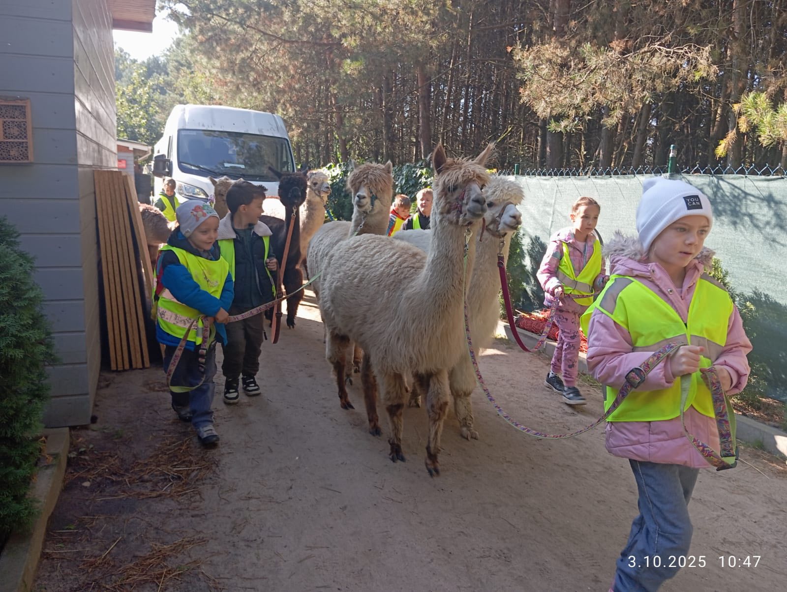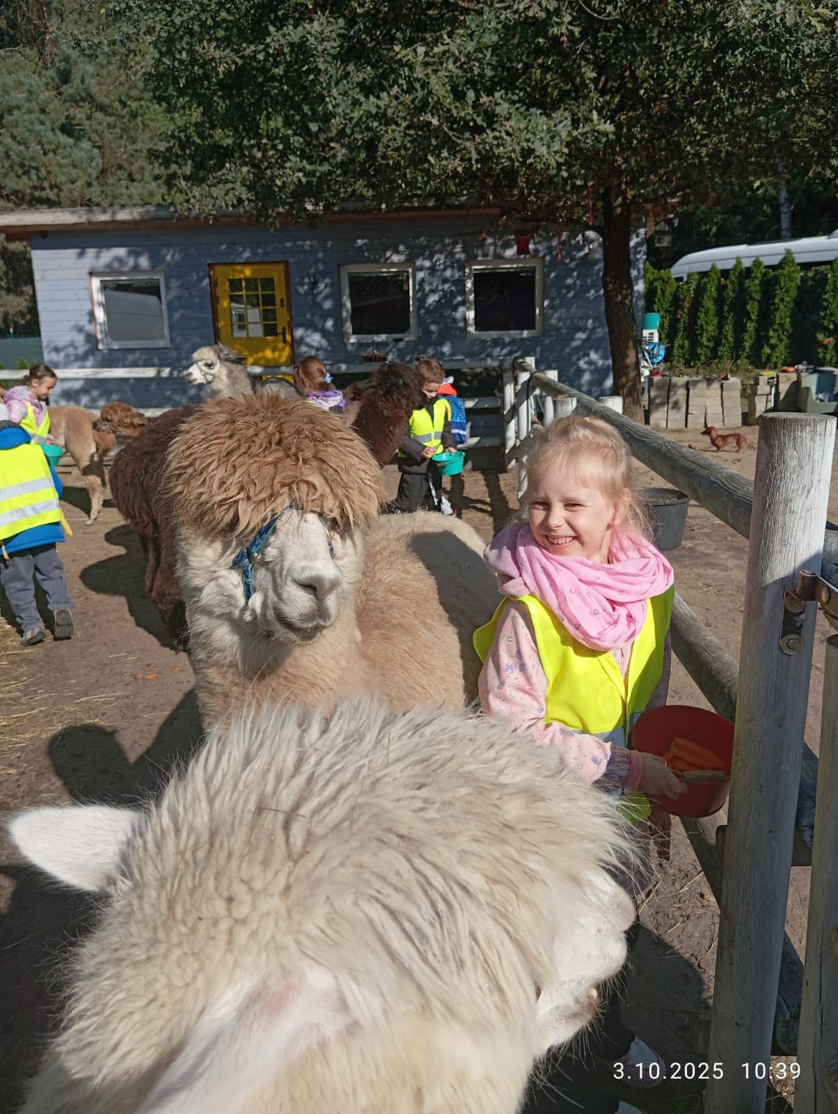Wycieczka do Orzechowe Alpakove Love okazała się dla grup Sówek, Misiów i Kotków prawdziwą terapeutyczną ucztą dla zmysłów. Dzieci, przebywając w otoczeniu spokojnych alpak i natury, mogły cieszyć się wyciszającą atmosferą, wzmacniającą poczucie bezpieczeństwa i rozwijającą empatię. Każda grupa, osobno i w swoim tempie, piekła na ognisku pyszne kiełbaski, a później korzystała z licznych atrakcji — trampolin, huśtawek oraz strzelania z łuku. Na najmłodszych czekały także słodkie przysmaki: świeżo przygotowany popcorn i wata cukrowa. Dzień minął pełen uśmiechów, radości i nowych, pięknych doświadczeń.