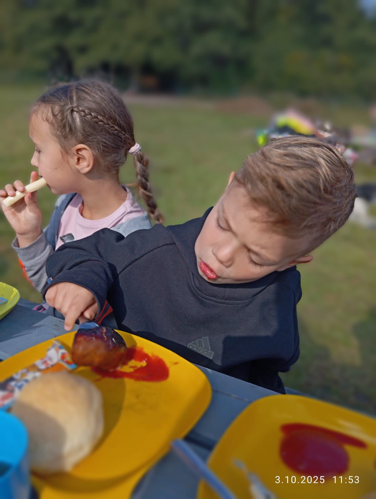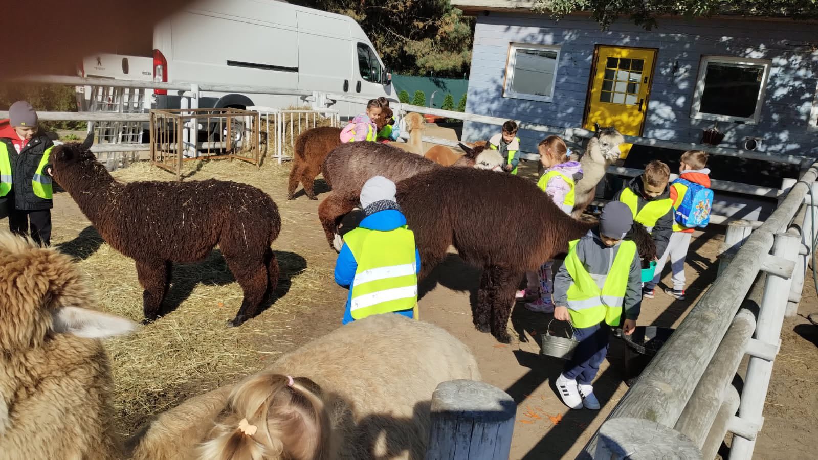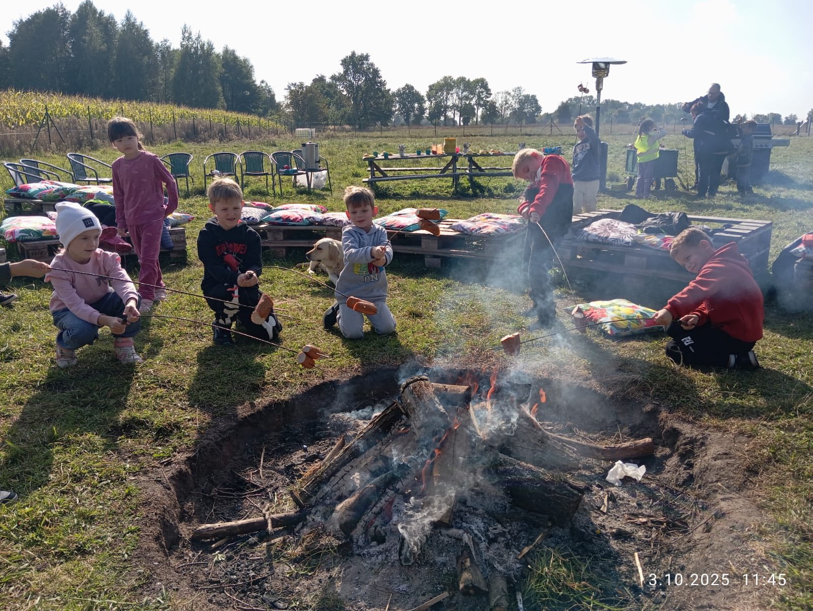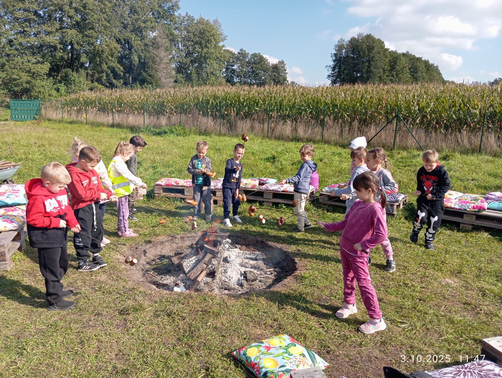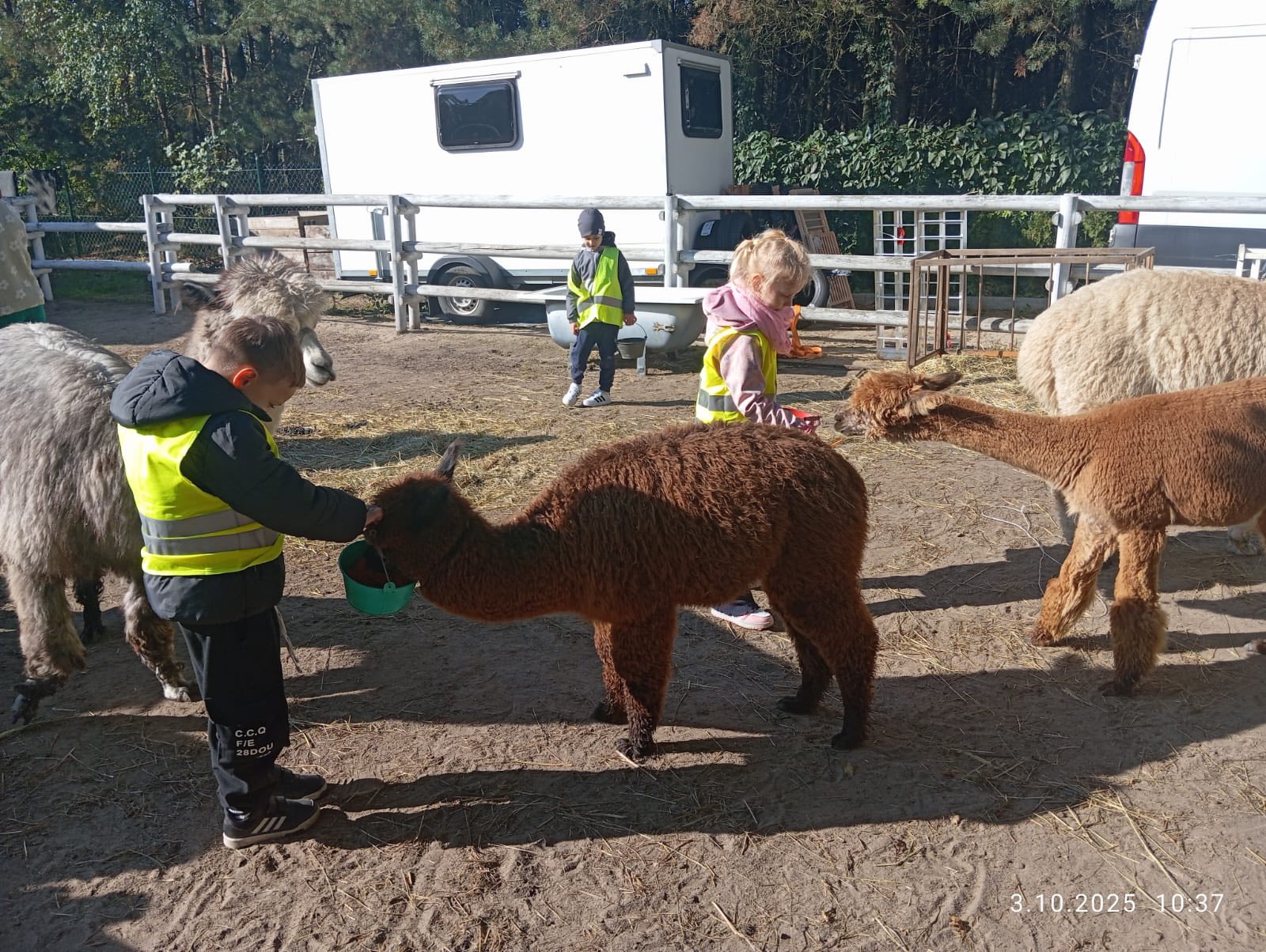Wycieczka do Orzechowe Alpakove Love okazała się dla grup Sówek, Misiów i Kotków prawdziwą terapeutyczną ucztą dla zmysłów. Dzieci, przebywając w otoczeniu spokojnych alpak i natury, mogły cieszyć się wyciszającą atmosferą, wzmacniającą poczucie bezpieczeństwa i rozwijającą empatię. Każda grupa, osobno i w swoim tempie, piekła na ognisku pyszne kiełbaski, a później korzystała z licznych atrakcji — trampolin, huśtawek oraz strzelania z łuku. Na najmłodszych czekały także słodkie przysmaki: świeżo przygotowany popcorn i wata cukrowa. Dzień minął pełen uśmiechów, radości i nowych, pięknych doświadczeń.