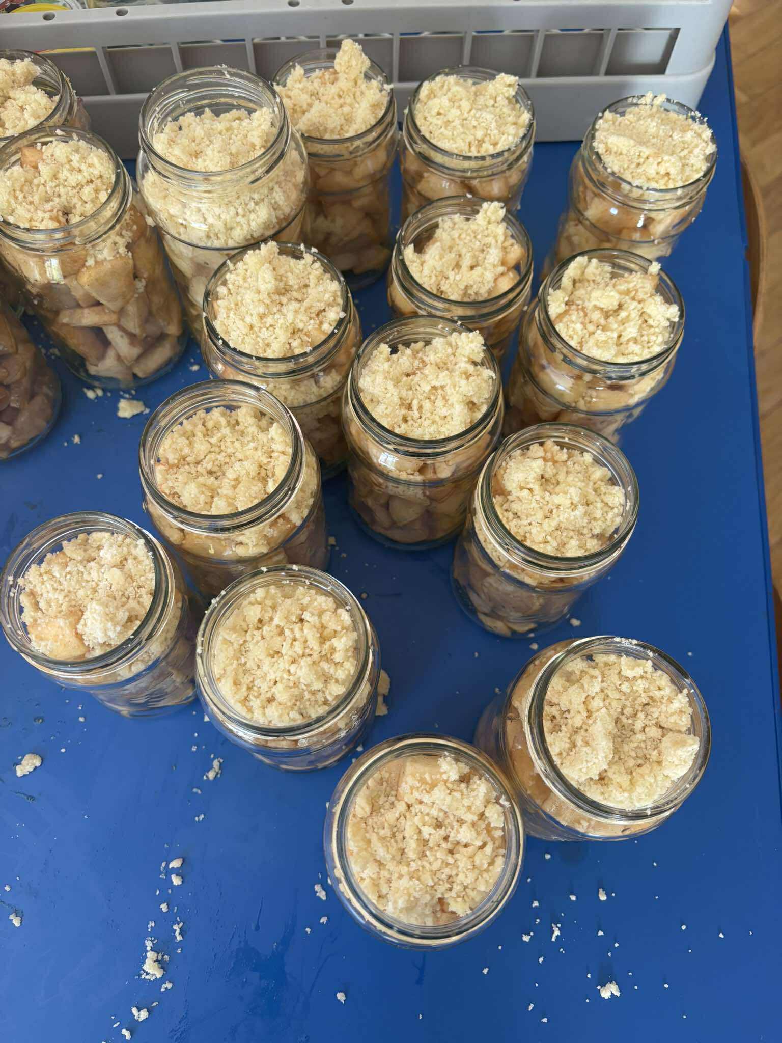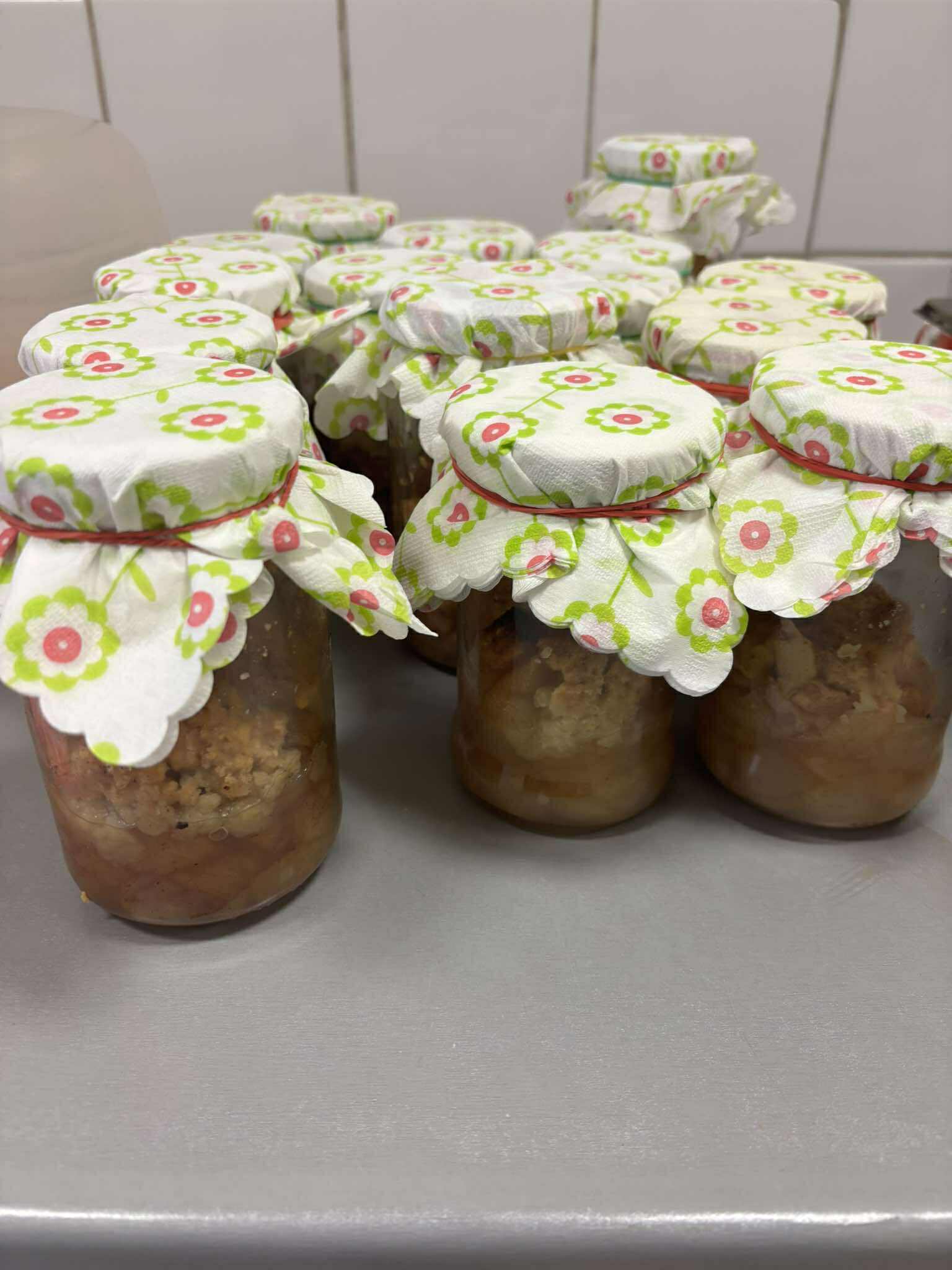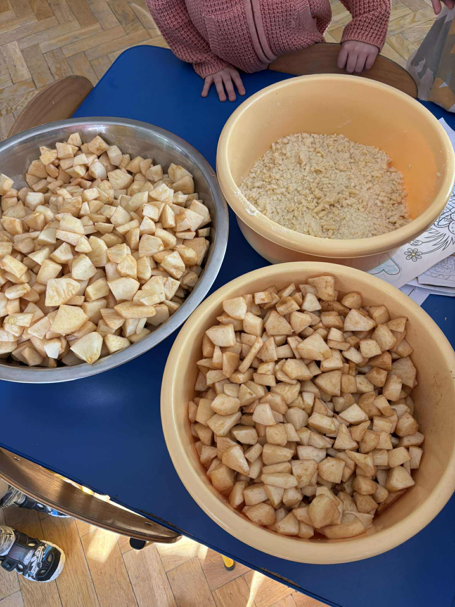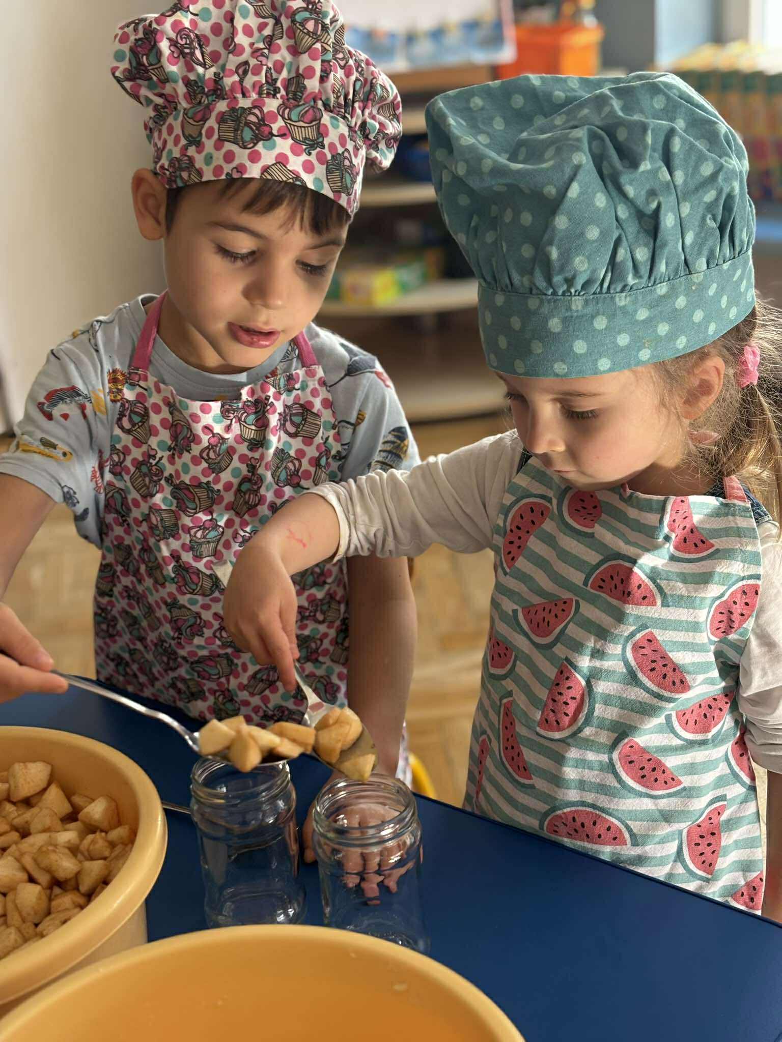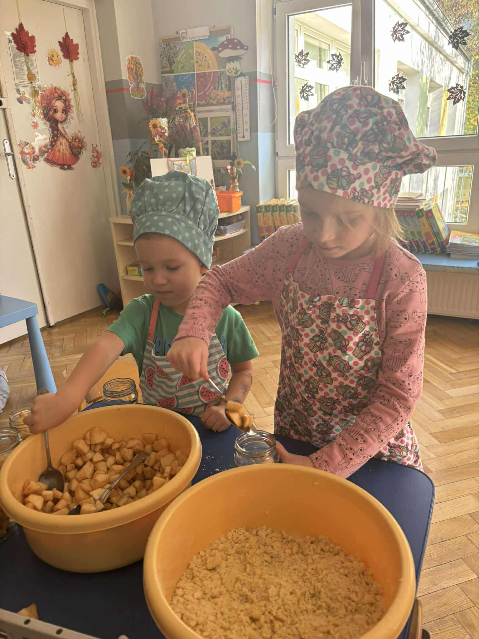 W naszym przedszkolu dziś zapachniało prawdziwą jesienią. Dzieci z grupy „Koty” przygotowywały pyszne szarlotki w słoiczkach. Najpierw wspólnie obrały i pokroiły jabłka, później przygotowały ciasto, a na końcu z zapałem nakładały wszystko do słoiczków. Podczas pieczenia w całym przedszkolu unosił się cudowny aromat jabłek i cynamonu, który wprowadził wszystkich w jesienny nastrój.