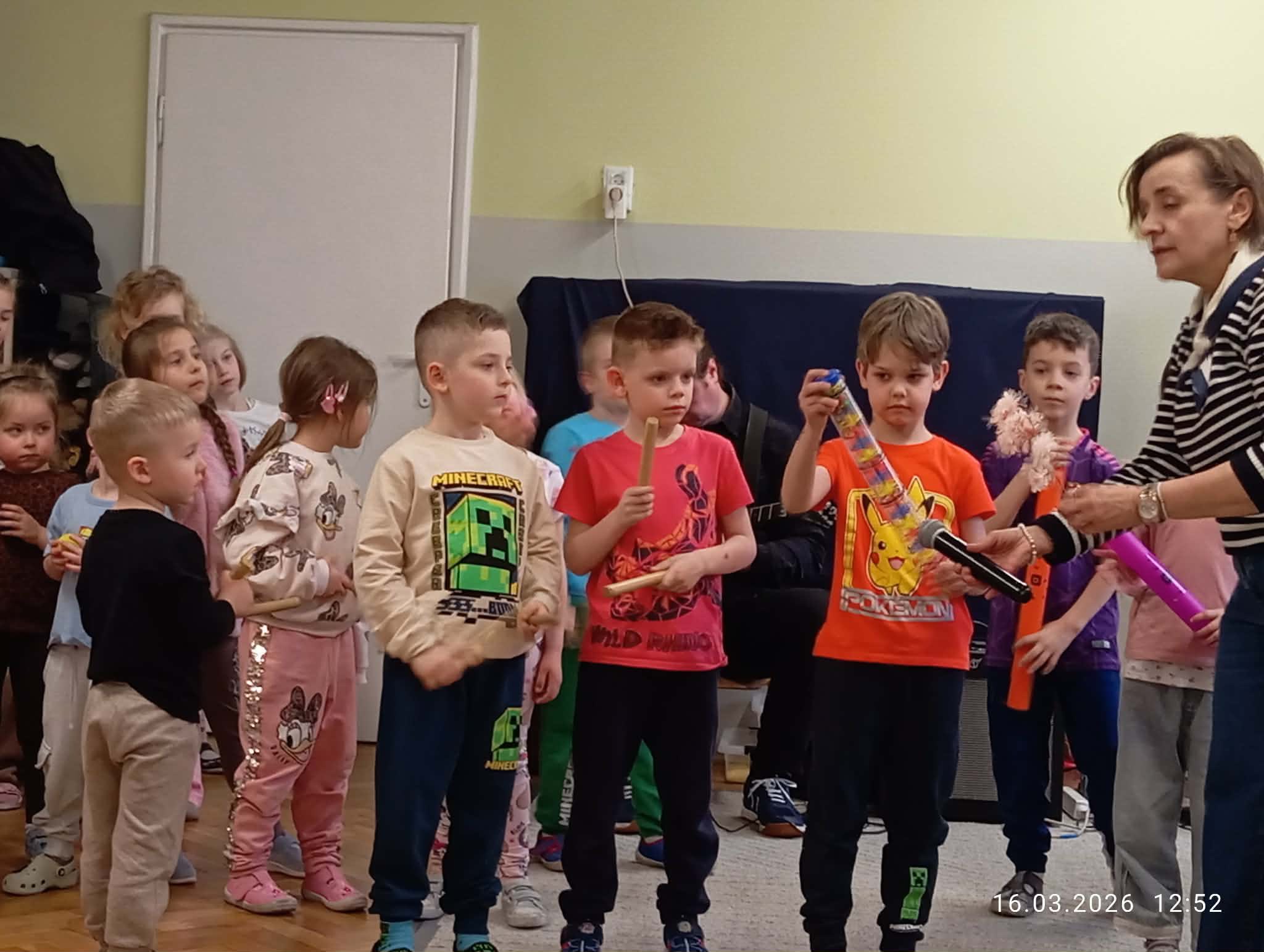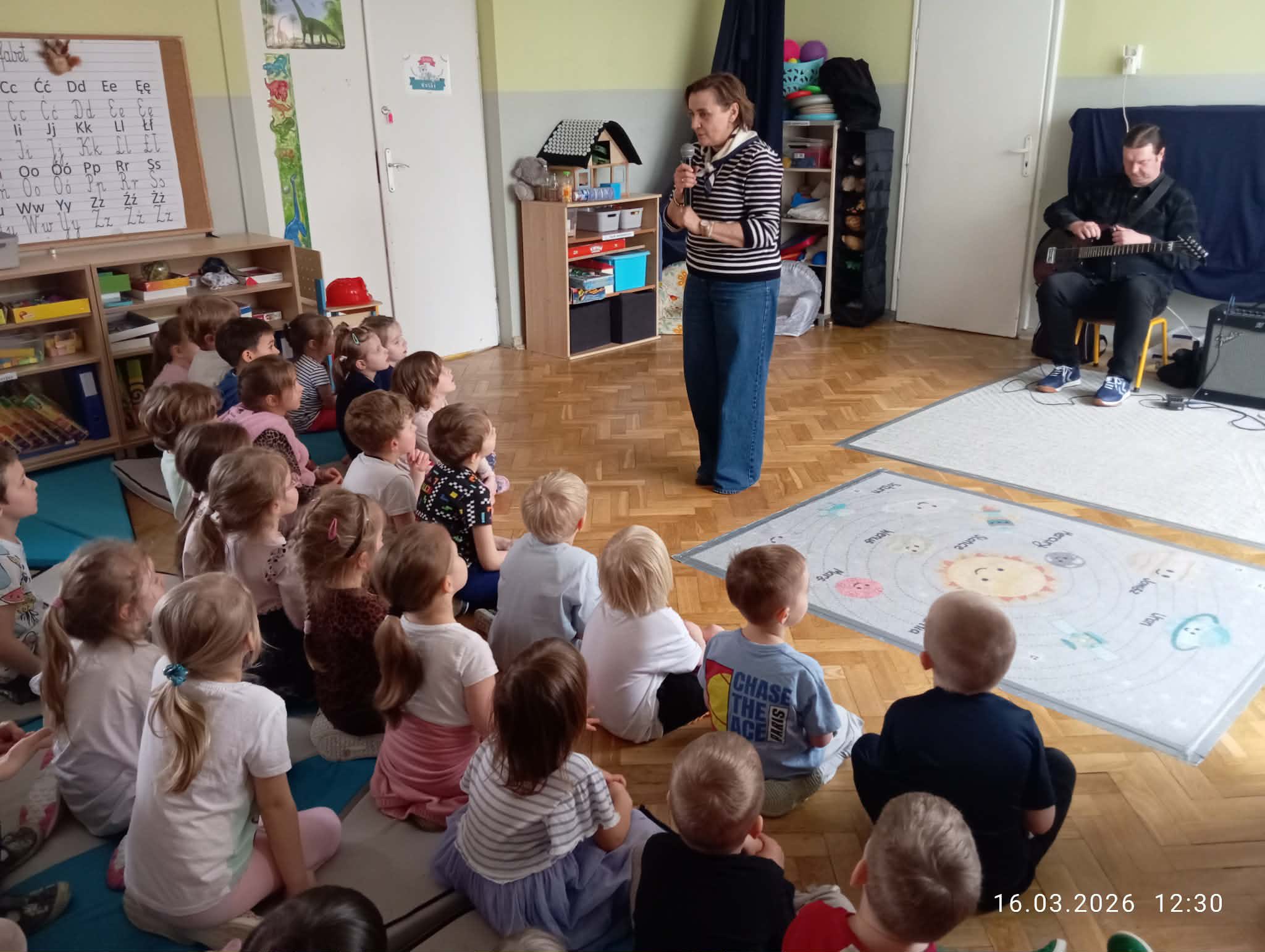 Podczas spotkania z Panią Muzyką dzieci poznały gitarę elektryczną i basową – ich wygląd, brzmienie oraz sposób gry. Słuchały różnych utworów, także z dzieciństwa rodziców i dziadków, rozwijając wrażliwość muzyczną i ciekawość świata dźwięków. Dziękujemy Radzie Rodziców za zorganizowanie kolejnego spotkania.