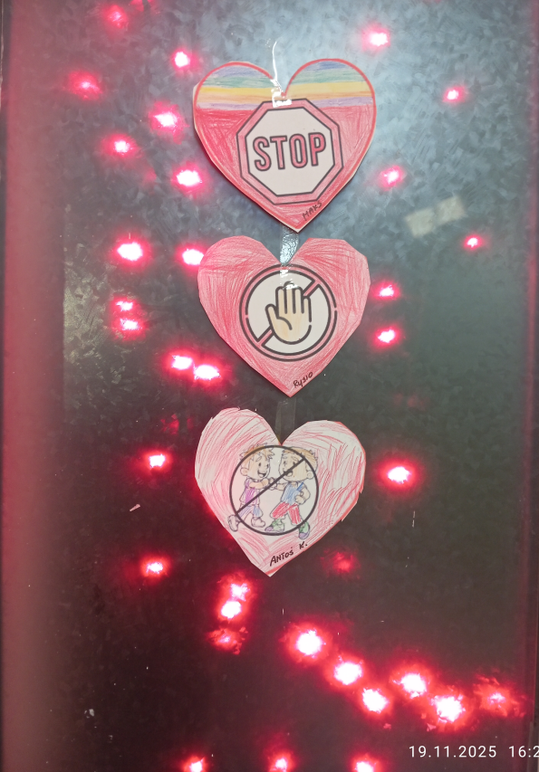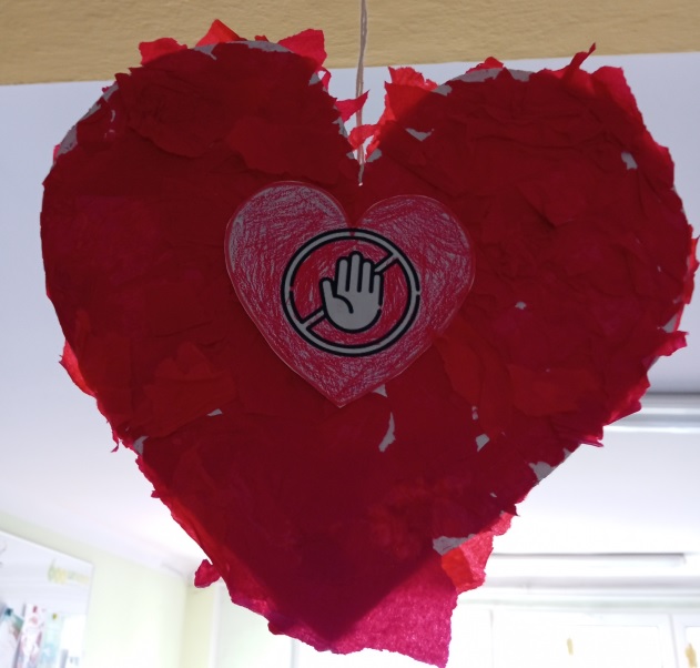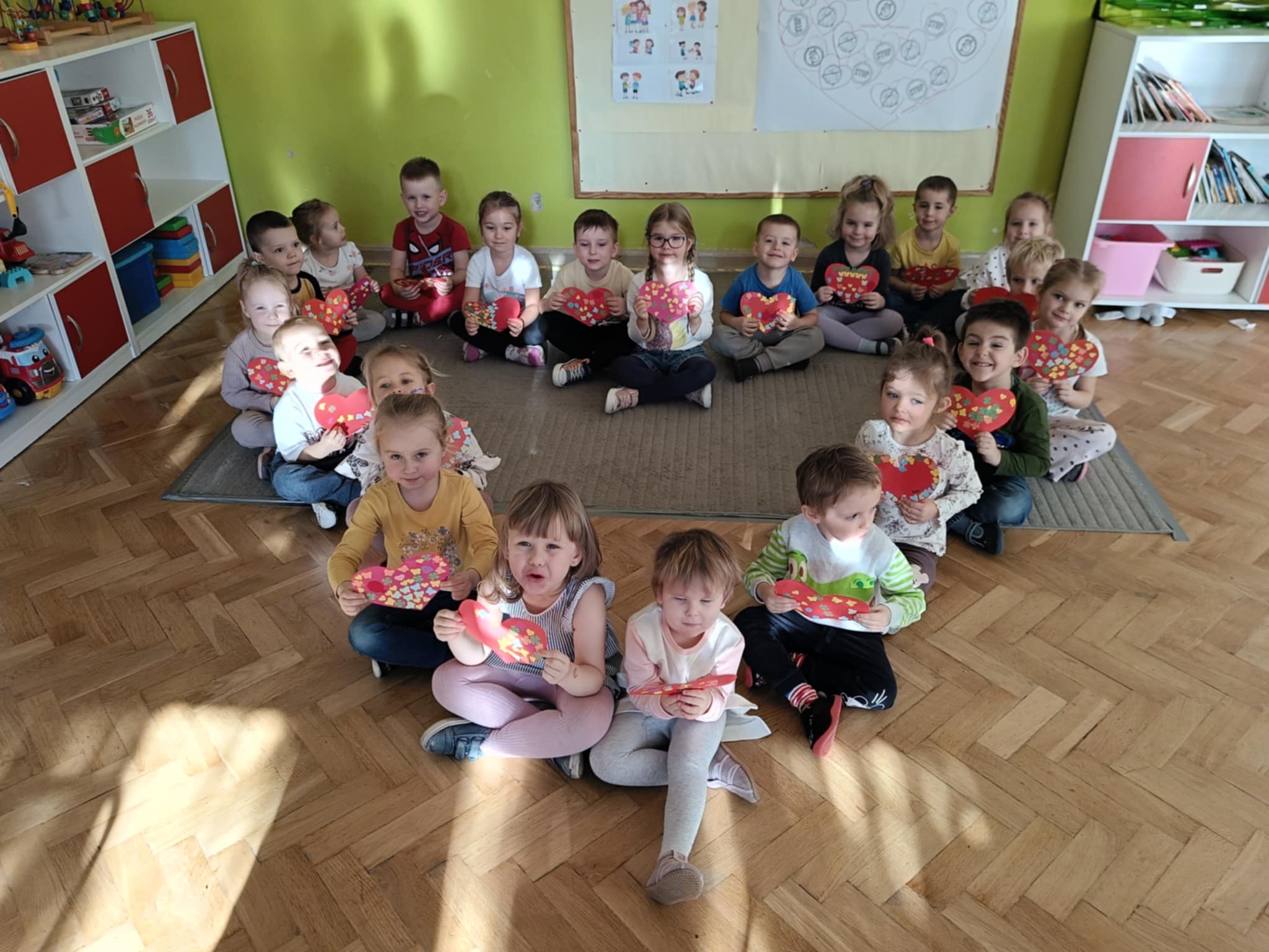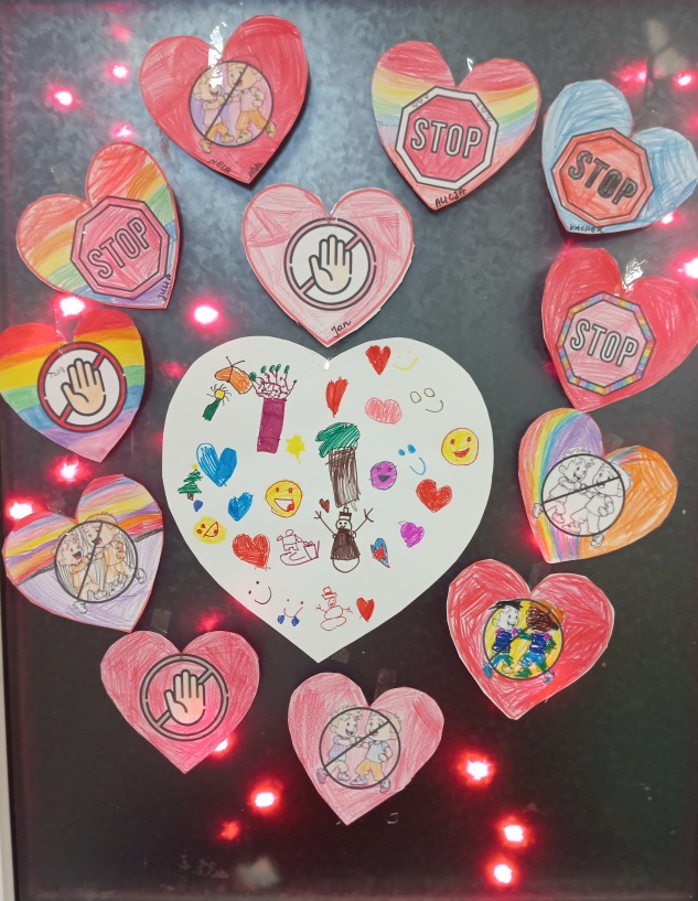 Przedszkolaki rozmawiały o tym, czym jest przemoc, dlaczego wzajemna pomoc i życzliwość są tak ważne oraz jak wiele może znaczyć zwykły uśmiech skierowany do drugiej osoby. Dzieci kolorowały czerwone serca – symbol miłości, wsparcia i bezpieczeństwa.